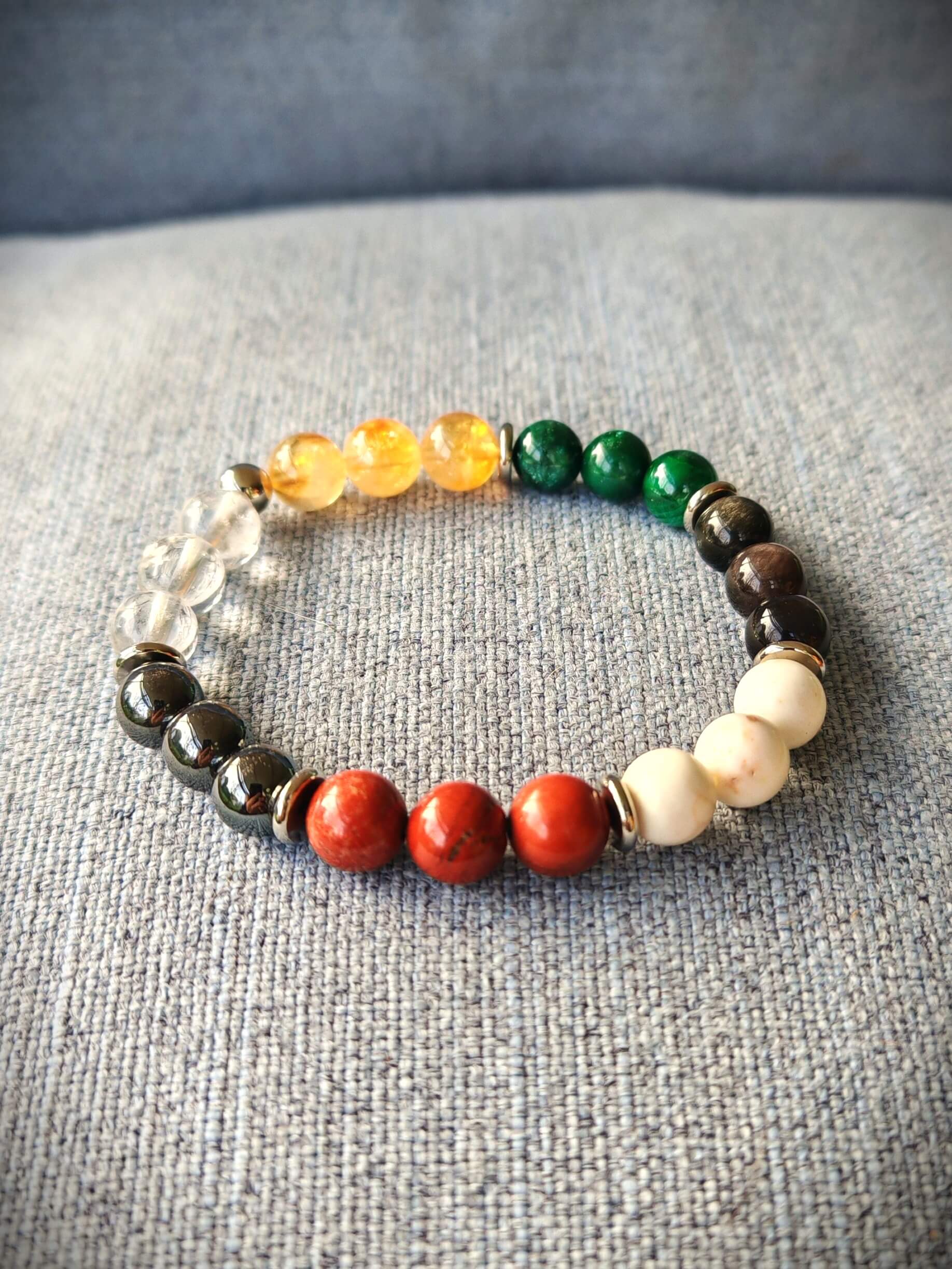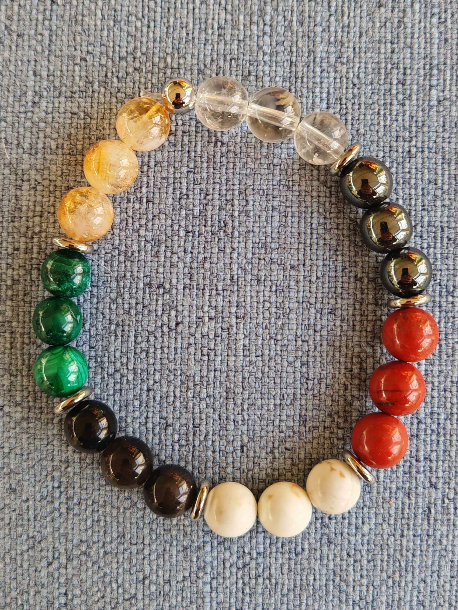 Le bracelet bien-être global est composé de pierres naturelles, utilisées depuis des siècles dans diverses traditions pour leurs vertus énergétiques et symboliques. Associant citrine, malachite, obsidienne, magnésite, jaspe rouge, hématite et cristal de roche, il vise à apporter équilibre, apaisement et vitalité dans la vie quotidienne.